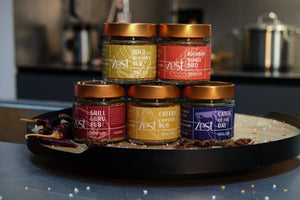 Zout, rietsuiker, knoflook, peper, chilipeper, ui, cayennepeper, zwarte peper, koffie, mosterdzaad, korianderzaad, venkel.