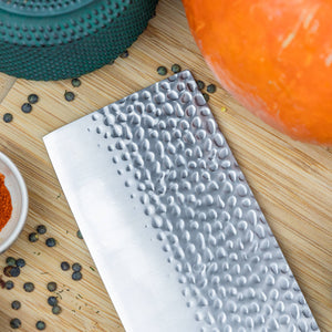 Het platte, stevige mes is meer dan alleen een snijgereedschap: het fungeert ook als een crusher voor kruiden en noten en zorgt ervoor dat ingrediënten naadloos worden overgebracht. Het met de hand gehamerd Tsuchime-patroon voegt niet alleen een traditionele esthetiek toe, maar verbetert ook de functionaliteit door de wrijving tijdens het snijden te verminderen.