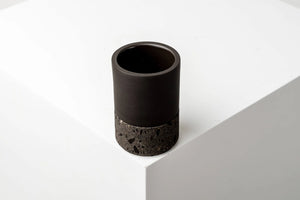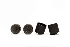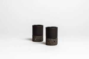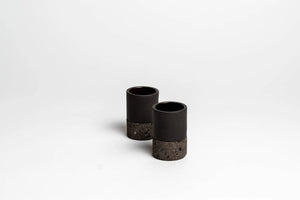 Twee handgemaakte zwarte kleibekers, elk met een op maat gemaakte zwarte cantera-stenen voet.
